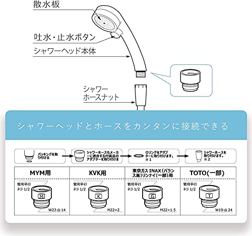 【適合するシャワーヘッドブランド】本商品はG1/2のナットが付いてるシャワーヘッドに適合します。KAKUDAI(カクダイ)、TAKAGI(タカギ)、TOTO(トートー)の一部製品、SAN-EI(三栄水栓製作所))、INAX(バランス釜以外)の一部製品、YuKoの一部製品に適合します。