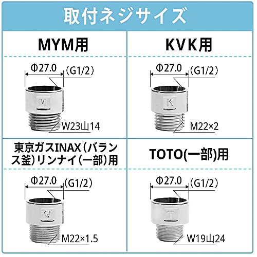 【適合するホースのブランド】本商品はホース側のネジ がW23山14(MYMなど),W19山24(TOTO社の一部製品),M22×1.5(東京ガス・INAX・リンナイの一部製品),M22×2(KVKなど)のホースに適合します。