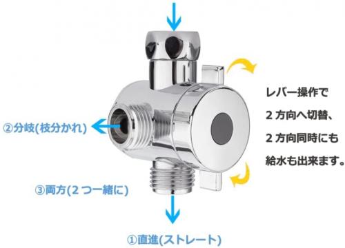 【分岐バルブ】万能ホーム水栓や自在水栓に取付けできます。レバー操作で2方向へ切替、2方向同時には給水も出来ます。