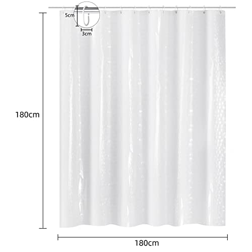 【シャワーカーテンの商品仕様】サイズ:180x180cm。素材:PEVA。パッケージ内容:カーテン1+プラスチック製カーテンリング12。仕様:防水防カビ。