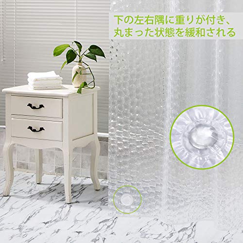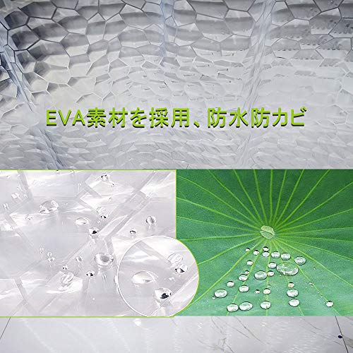 【半透明で3D立体設計】:3D立体設計で、上品でおしゃれです。半透明で浴室内も暗くなることがないので、明るさをキープできるし、圧迫感もありません。また銅製ハトメ付き、錆びにくいし、丈夫で長持ちです。しっかりした生地でシャワーカーテンを長時