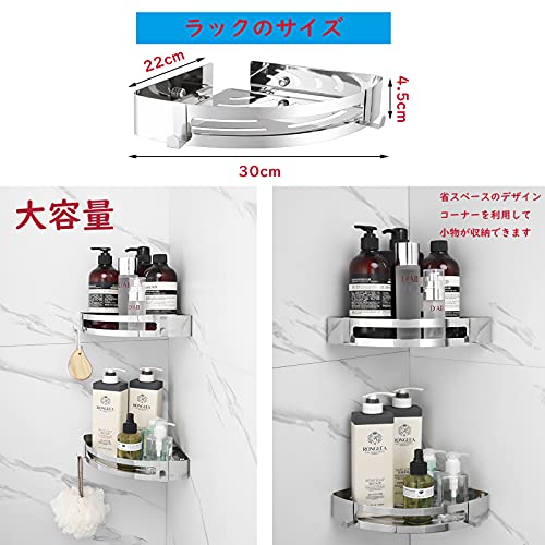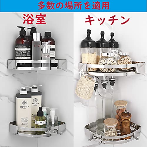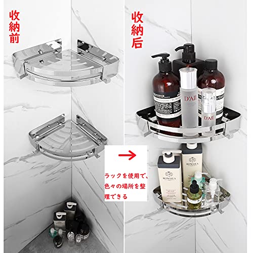 【実用的なデザイン・多用途】本製品は透かし彫りの三角形タイプのラック、コーナーにぴったり収まるまだ水がたまりません、通気性も良い。石鹸やボディソープなどの小物収納に便利です。さらにフックを付属する、スポンジやブラシ等が掛けておける。スペースを節約でき、整理しやすいデザインです。