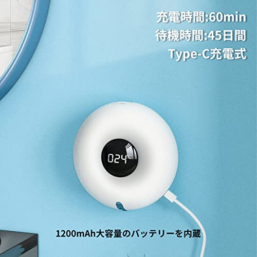 【USB充電式】Type-C充電式で、容量1200mAhのバッテリーを内蔵しています。完全充電には約3時間かかり、1回の充電で約45日間使用できます、長時間スタンバイ。(ご注意:充電器を使用して充電する場合は、ディスペンサー本体を傷つけないために、5V/1Aの充電器を使用してください。)【取り付け簡単】器具上の蓋を開けて洗剤を入れます。コンセントが必要ないため、置