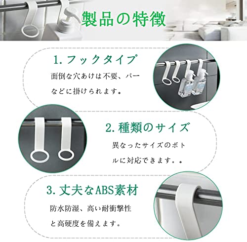 【2種類のサイズ】整理整頓するためのディスペンサーボトル用フックホルダーセットです。口径約2.5cmと口径約3.1cmの2種類のサイズのフックホルダーが含まれております。