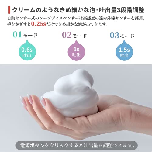 【非接触泡用式&吐出量3段階調整】自動センサー式のソープディスペンサーは高感度の赤外線センサーを採用、手をかざすと待たずにクリームのようなきめ細かな泡が出てきます。汚れた手に直接触る必要がないため、二次汚染を防止し、より衛生的です。気液は12:1の比率出ていき、泡が均一で繊細になります。スイッチをクリックして、簡単に吐出時間を調整できます。段階は0.6秒、2段階は1秒、3段階は1.5秒です。子供の手洗い用、大人の手洗い用と食器洗い用を分けて無駄遣いを防ぎます。