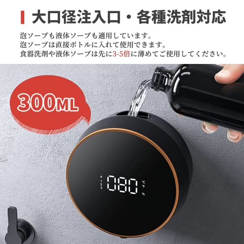 ソープディスペンサー KAWEINA 泡 自動 3段階排出量 2000mAh充電式 300ml容量 室温と電量表示 壁掛け 黒 W1-Black