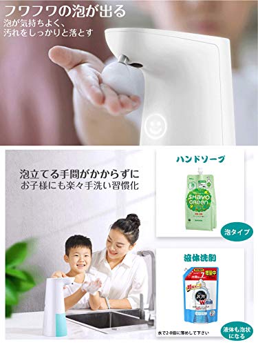 【フワフワの泡立ち】泡ソープだけでなく液体洗剤も使え、手に取る時に泡で出てくるのでしっかり泡立てる手間がなく肌に優しいです。大人はもちろん、フワフワの泡にお子さんも大喜び、楽しい泡洗いで手洗いを習慣化するのにも最適です。作動時にはLEDランプが10回点滅する事で、10秒以上手を洗うことをお知らせしてくれます。手に残った雑菌もすっきり洗い流され、とても衛生的です。