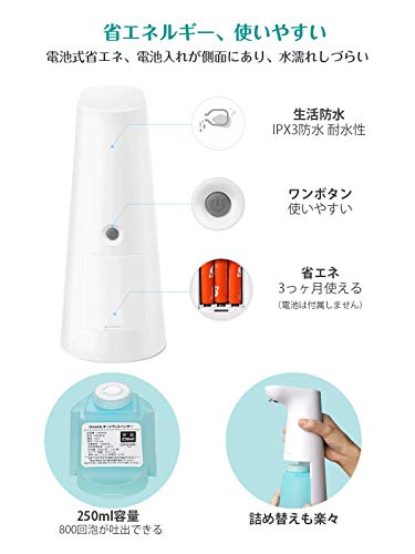 Umimile ソープディスペンサー 泡 自動 ハンドソープディスペンサー オート センサー 吐出量2段階調整 250ml 電池