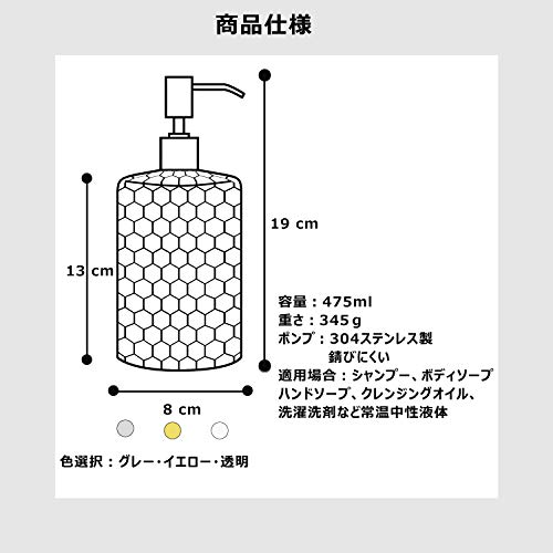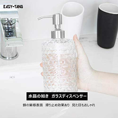 おしゃれ:蜂の巣のような切子面、つかみやすい、滑り止めの効果がありながら美しい光沢を反射できるディスペンサーです。このボトルは透明無色なので、清潔感抜群!玄関、台所、バスルーム、化粧台、洗面所、どんな場所にも適用です。
