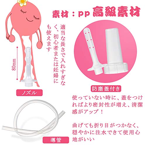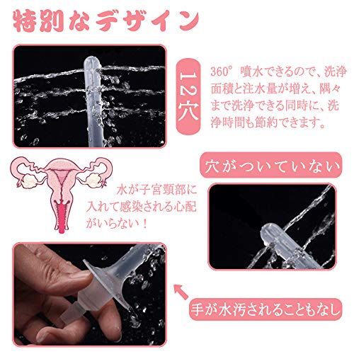【12穴】:ノズルの両側には12穴があり、360°噴水できるので、洗浄面積と注水量が増え、隅々まで洗浄できる同時に、洗浄時間も節約できて、普通の洗浄と異なる爽快感が感じられます。それに、ノズルの上部に穴がついていないデザインで、洗浄する時、水が子宮頸部に入れて感染される心配がいらなく安心に使えます。