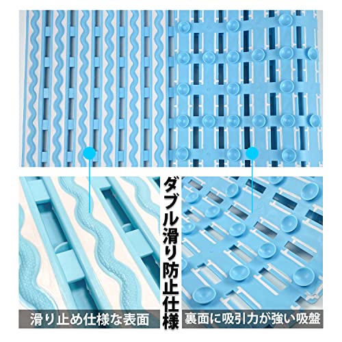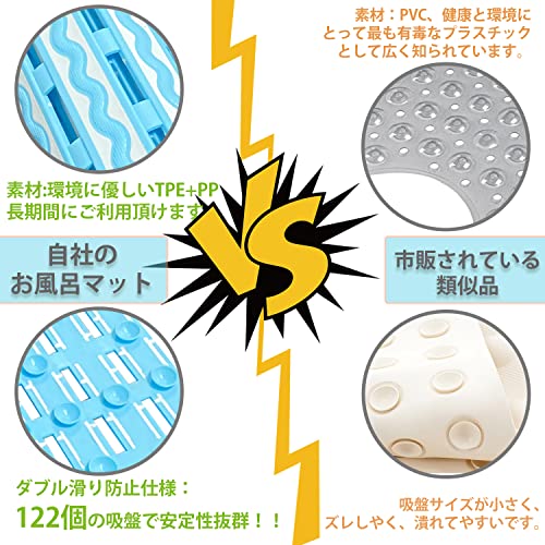 【ダブル滑り防止仕様】:裏面が122個の吸盤で安定性抜群!床としっかり吸着固定、ズルズル動いたりしません。マットの表面にある260個の突起が滑り止めの上で、足裏やお尻に適度の刺激を与え、極楽のお風呂を是非ともご体験ください。