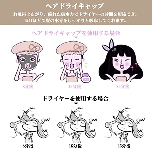 【ヘアドライキャップ】ふわふわのヘアドライタオルは髪をやさしく守りながら、15分ほどで髪の水分をしっかりと吸収してくれます。ドライヤーの時間を短縮できるので、髪の摩擦や熱風によるダメージを予防できます。シャワーを浴びた後大変活躍します。