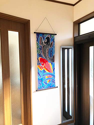 7色のそれぞれの色型を使い1色1色手染めで職人の手間と心をこもった作品です。伝統的で縁起の良い鯉の滝登り絵柄です。出世や運気上昇の意味が込められていると昔から言われております。玄関、和室、床の間、洋室、廊下 など様々なシーンに飾ってお使いください。