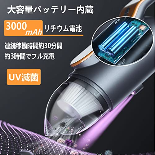 【強力なサイクロンと&低騒音】:最新世代の手持ち式掃除機は 超強力吸引13,000Pa及びほこり除去に有効である、38,000回転の高性能モーターによって安定した高吸引力を誇り, 車内隅々までスピード清掃、効率大幅にアップ!人間工学的に設計された、デシベルが65 Bd未満、耳に不快感を与えません。