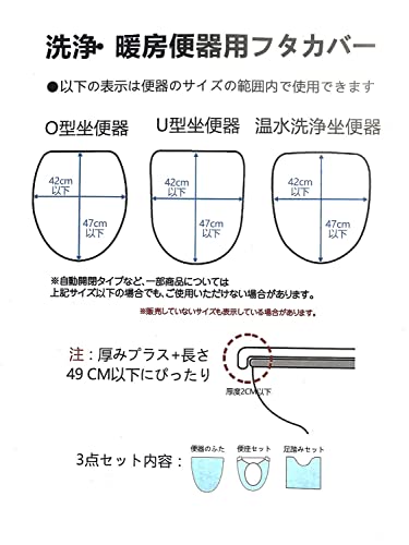 【素材】便座カバー 3セット(洗浄・暖房用) 素材:ポリアクリロニトリル繊維【サイズ】フロアマット:5560cm ふたカバーの縦のサイズ+ふたカバーの前厚みのサイズは41~46cmまで装着できる。 【輸送方法】佐川急便