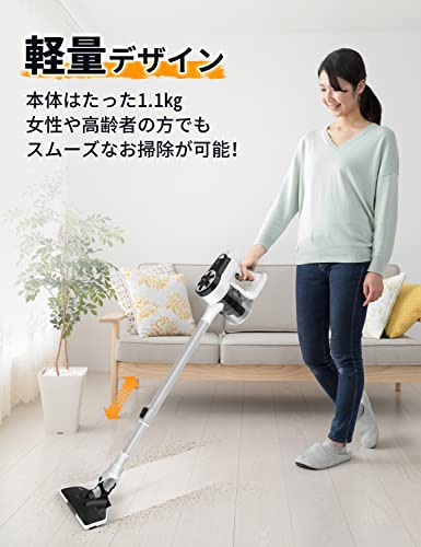 【6way 仕様&軽量】 伸縮パイプと隙間ノズルを簡単に組み立てて、スティッククリーナーとハンディクリーナーが自由に変身できます。階段、狭い場所、高い場所も長時間お使用できます。 本体は1.1kgの超軽量デザインで、女性やお年寄りの方もお気軽に利用いただけます。 長時間使っても、腰痛が感じません。