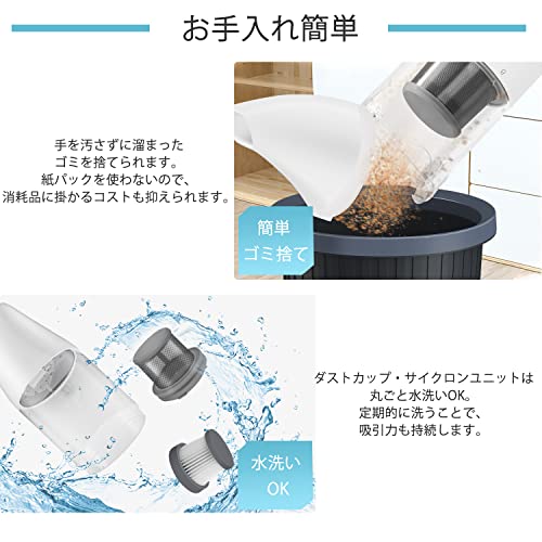 お手入れが簡単:コードレス掃除機使い終える順次に細孔金網とHEPAフィルターを取外し、埃を清掃し、水洗いしてください。その後、通風の所に置き、