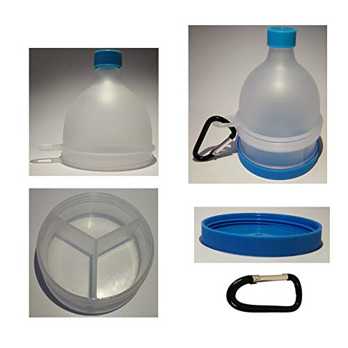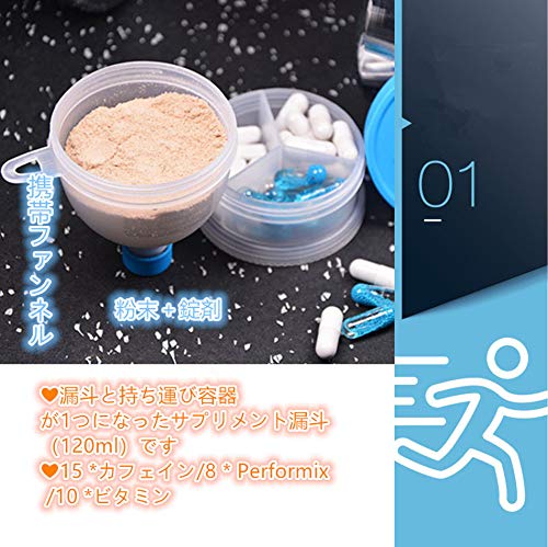 【高実用性携帯ファンネル、薬ケース】:漏斗と持ち運び容器が1つになったサプリメント漏斗(120ml)です。(粉末+錠剤)錠剤の持ち運びにも使えるし、アミノ酸の粉末、プロテインもに持ち運べる。