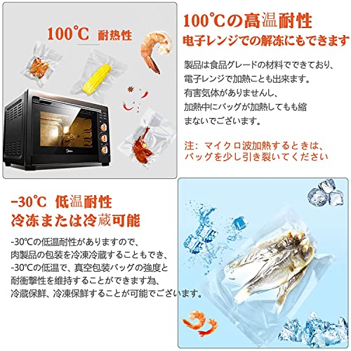 【用途の通用性】真空吸引により、パックを密封することで、食品の酸化・変質することを抑えます。細菌の繁殖を防ぎことにより、食材の鮮度を5~8倍に延長することができます。 Tinosyの真空バッグは耐高温・耐低温により、包装した食材を冷蔵庫に入れて冷凍・冷蔵したり、電子レンジに入れて加