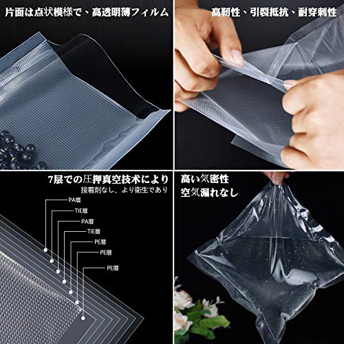 【高密度食品真空保存バッグ】Tinosyの食品真空保存バッグは、厚手の7層というの圧押し技術を採用しているため、密封性が素晴らしいし漏れにくいです。高温100[度]から低温-30[度]という環境でご利用出来ます。耐穿刺性、耐衝撃性が強がり、さまざまな食材、果物、野菜、肉、魚、魚介類、乾物、スナック、調理済み食品などの保存と保管に適用しております。食品の保存期間を延長します。