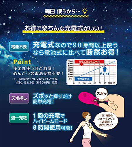 毎日使うから、お得で楽ちんがいい!充電式なので90時間以上使うなら電池式に比べて断然お得!使えば使うほどお得でめんどうな電池交換不要!充電方法はズボッと挿すだけ!1回の充電でハイビームモード8時間使用可能!エコノミーモードなら最大14時間使用可能なバッテリー長持ち設計!