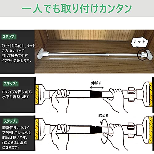 【簡単な取り付け】突っ張り棒を取り付けるのはくぎ/ネジ/パンチ等全部必要なく、突っ張るだけで簡単に設置できます。そして、壁に穴がある心配もなく、壁に痕跡も残さないので、賃貸住宅におすすめです。他に、つっぱり棒は自由に長さが調節でき、違う場所に合わせて取り付けられます。使用しない時に取り外すことも可能です。生活に便利な用品として欠かせないです。