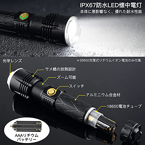 ズーム機能&IPX67防水搭載:ヘッド部分を回転させるだけで、照射距離と照射範囲を連続的に調整できます。照射距離は最大約700メートルです。本製品は水の侵入に対するIPX67の生活防水機能が搭載しており、日常生活での雨水などに防水できます。優レ多耐水性能です。