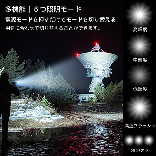 5段階モード機能:【高輝度-中輝度-低輝度-高速フラッシュ-SOSオフ】の5種類点灯モードで、スイッチを押すだけで切り替わり、とてもシンプルな操作です。用途に合わせて切り替えることができます。