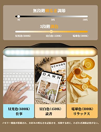 【3段階調色可能&無段階調光】このデスクライトには、スイッチ一つだけで3種類の色温度と無段階の明るさが調整可能となります。スイッチをワンタッチで調色できます。((1)勉強のため文字くっきり光(約6000K)を搭載して、文字が読みやすいです;(2)そして、自然光をまねる柔らかい光(約4500K)は、パソコンなどのデバイスを使う時目をしっかり守ってくれます;(3)また温もりや落ち着いた雰囲気を感じる電球色(約3000K)もあります。)スイッチを長押しすると、0-100%の無段階調光ができ、お好みの明るさへ細かく調整することができます。デスクライトはメモリー機能も搭載され、お好みの明るさを記憶させ、再開する時に、わざわざ調節必要がない。