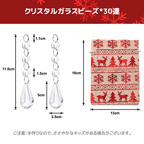 【30連のクリスタルビーズ】3個のハ角形のビーズと八面の雫型のトップ部分からなるクリスタルビーズで、30連のセットです。長さは11.6cmで、幅は2.5cmです。プラスチック袋と18×13cmのジュート製巾着袋の2重のパッケシーで、傷つきにくいです。