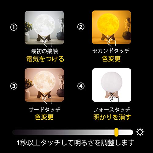 【三色の切り替えと無極な調節】:ムーンランプ下部の金属リングをタッチして、ライトのオン/オフを切り替えたり、色(黄/白/ウォームホワイト)を変更したり、丸い穴を長押しして明るさを調整したりします。