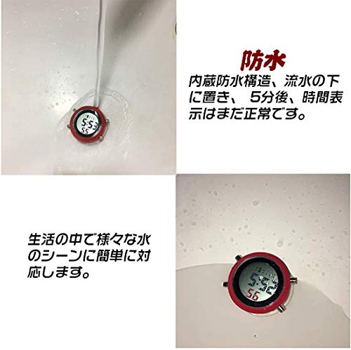 【防水仕様】流水のしたに置き、5文後、時間表示はまだ正常で、防水効果抜群です。水滴のかかる水回り周辺で大活躍します。浴室内で置くこともキッチン内で使用することもできます。防水加工されますのでお風呂や濡れたところでご使用には完璧!防水ですが、長い間水に入れないでください。