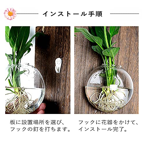 ?インストール手順:1、板に設置場所を選び、フックの釘を打ちます。2、花瓶に花或いはドライフラワーを入れます。3、フックに花器をかけて、インストール完了。