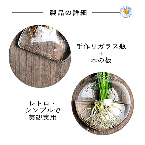 ?仕様:木製壁掛け水耕栽培のガラス花器(植物無し)、?素材:高ホウケイ酸ガラス、木、手作りガラス瓶+木の板の様式、壁掛け式フラワースタンド、2つの部分で組み立てます。花瓶は吊り下げ穴があります。透明ガラス瓶を木の板に掛けて、装飾性があり、レトロ・シンプルで美観実用。水を交換する時、花器の取り出しは便利です。