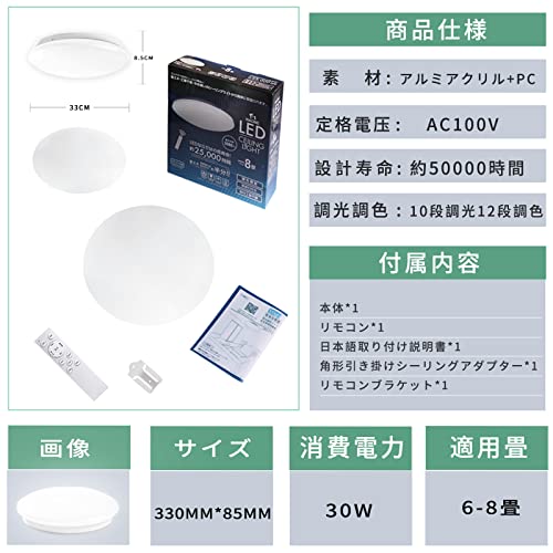 | 商品名 | LEDシーリングライト 8畳 30W 調色/調光タイプ 昼光色 電球色 3080LM アプリ制御 リモコン付き 調光タイプ LEDライ |