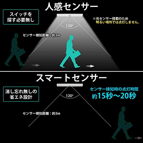 ??光・人感センサーを搭載?:暗い場所だけで働く、人間が120度以内で最大3メートルの検出範囲内で夜間動作を検知するとすぐ点灯。感知範囲で離れなくて消灯しない。この範囲から離れて後15秒自動消灯。昼間或いは明るい場合に人体動きを感知しても点灯しない。