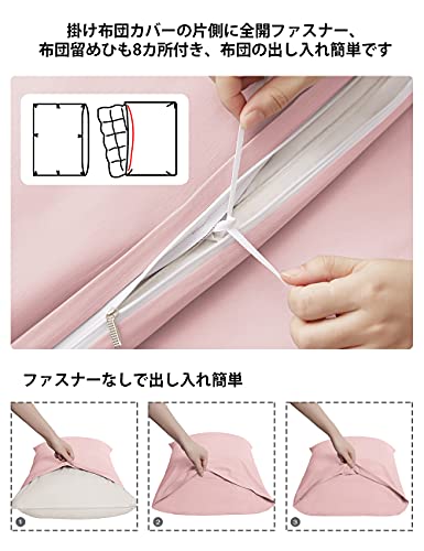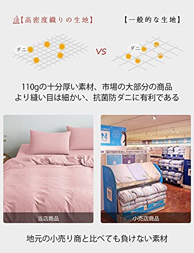 【セット内容】掛け布団カバー(1枚)190210cm、片側に全開ファスナー、布団留めひも8カ所付き、布団の出し入れ簡単。ボックスシーツ(1枚)140200+30cm、全周ズレ防止ゴム付き、約3-25cmの敷き布団とマットレスに装着可能です。枕カバー(2枚)4363cm、封筒式、ファスナーなしで出し入れが簡単。
