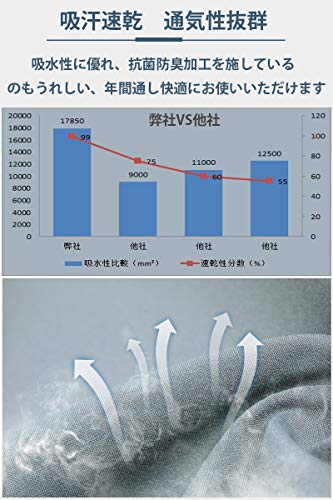 【素肌にやさしい生地】:活性染色工芸を採用し、色褪せなくて毛玉の心配も必要ない。防臭、防ダニ、抗菌、ホルムアルデヒド無し。毎日、素肌に触れるものだからこそ、抗菌防臭加工を施しています。ほこりや毛羽立ちが出にくいのも特徴で