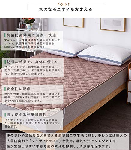 通気性に優れたメッシュ素材に、汗の臭いや加齢臭などを抑える消臭加工を施した、吸水速乾敷きパッド。中わたには帝人の抗菌防臭わた「マイティトップ」を使用し、菌の繁殖を抑制し清潔感を保ちます。さらっとした肌さわりでムレにくく、暑い季節もベタつきにくい。