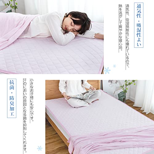 【ひんやり敷きパッド Q-MAX0.42】生地に触ると冷たい感じができる素材を使用した敷パッドです。暑い日や寝苦しい日も快適とした感触をお楽しみいただけます。ツルツルの素材、お布団に入る瞬間のひやっと感を防いで快適に眠れます。
