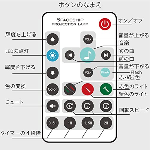 【リモコン式&タイマー機能付き】LEDプロジェクターは簡単な操作ができます(電源ON/OFF、ライトの明るさ調整、音楽再生モード切り替え、音量と曲調整)が、リモコンは前の操作