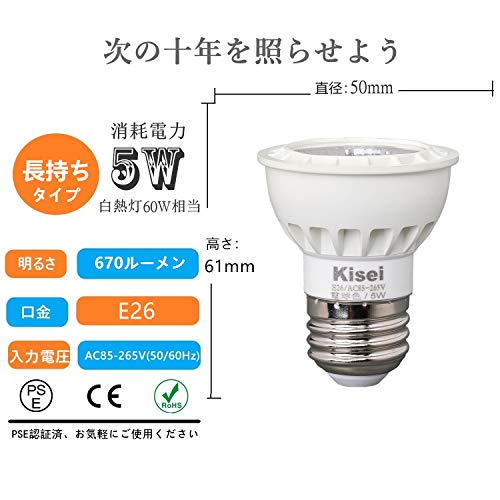 | 商品名 | LEDハロゲン E26口金 LEDスポットライト 5W 明るさ60W相当 照射角60° 演色性Ra90+ 非調光 (E26口金, 昼光色2個セット |