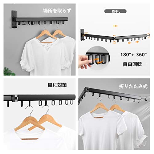 【180°+360°自由回転】180°+360°回転の原因で楽々と衣服を干します。窓際やベランダに設置すれば、晴れた日には物干しを窓の外に出してもいいです。雨・雪・花粉・スモッグなど、梅雨季節と台風の日では、室内を取り戻すことができます。動作一つで屋内と屋外を簡単に切り替えます。とても実用的です。