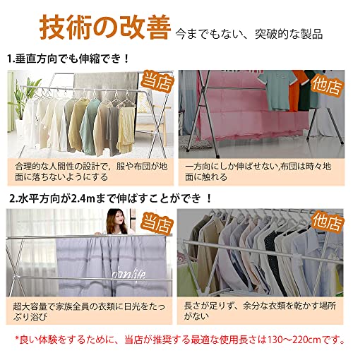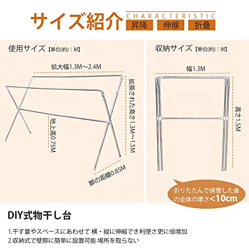 ?【革新型伸縮式】水平方向だけではなく、 垂直方向にも伸縮できる突破的な洗濯物干しです。 水平伸縮性:130~240cm,垂直伸縮性:130~150cm、奥行約85cm,重量(kg):約5.3kg。 折りたたんだサイズ:135150cmです。