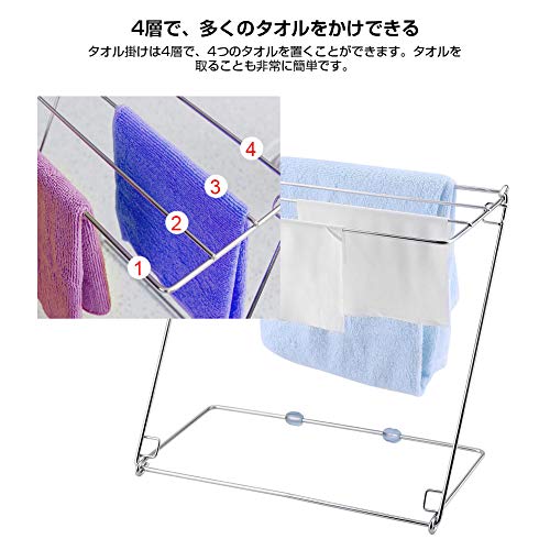 【4層、多くのタオル掛け】このタオル掛けは4層の設計、少なくとも4つのタオルを置くことができます。タオルを取ることも非常に簡単です。風通しがよく、乾きやすくなります。室内干しがかんたん便利になります。全方向からタオルを干せます。