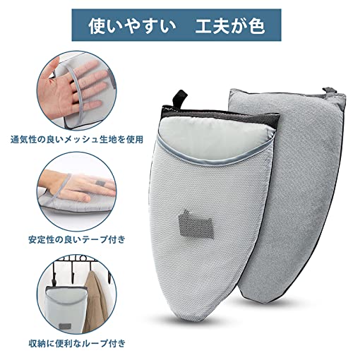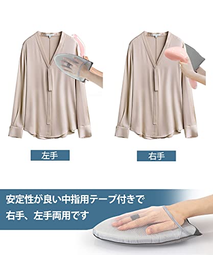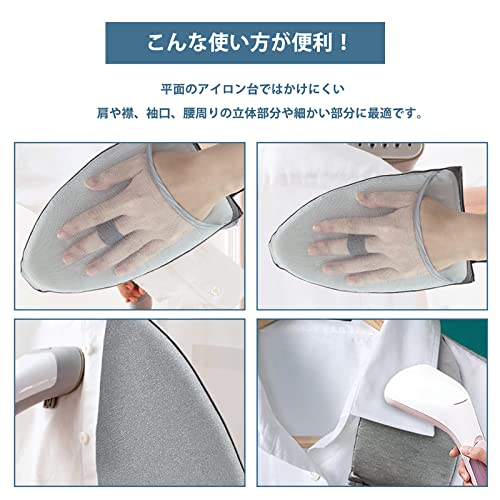 【尖ったデザインで角度が調節できるアイロンミトン】尖ったデザインで肩・袖口・腰回りなど立体的部分、細かい部分にも最適です。ハンガーに掛けた状態でアイロン掛けできる、スチーム対応のアイロンミトンです。アイロン台を使わず、サッと仕上げたいときに便利なミトンタイプです。 手軽にアイロンをかけられます。手にはめることができるので、衣類をハンガーに掛けたま手軽にアイロンをかけることができます。