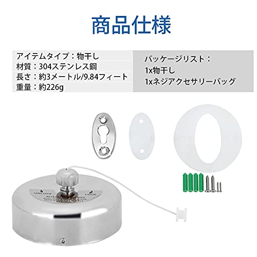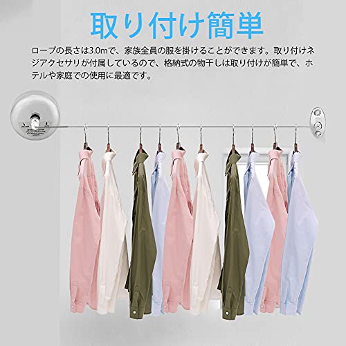【取り付け簡単】ロープの長さは3.0mで、家族全員の服を掛けることができます。取り付けネジアクセサリが付属しているので、格納式の物干しは取り付けが簡単で、ホテルや家庭での使用に最適です。