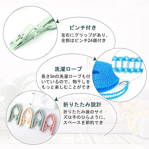 【ピンチと洗濯ロープ付き】この携帯ハンガーは左右にグリップがあり、全部はピンチ24個付き、ただ服の物干しハンガーではなく、靴下、下着など小さい物にも適用します。また、長さ5mの洗濯ロープも付いているので、物干しをもっと楽しむことができます。