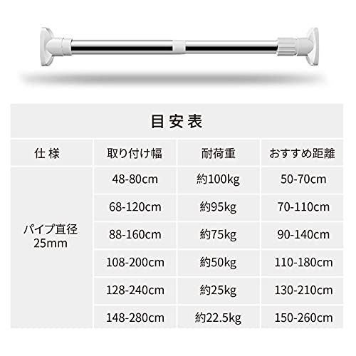 「高品質な素材」弊社の突っ張り棒はステンレスを採用した伸縮ロッドとABS樹脂を加工した圧着板を備えています。突っ張り棒の長さに応じて、耐荷重が約22.5~100kgです。また、ロックナットを内蔵しており、ステンレス製であるため、錆びたり、カビが発生しにくくて、長くご使用頂けます。