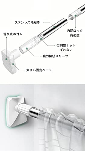 「高品質な素材」弊社の突っ張り棒はステンレスを採用した伸縮ロッドとABS樹脂を加工した圧着板を備えています。突っ張り棒の長さに応じて、耐荷重が約22.5~100kgです。また、ロックナットを内蔵しており、ステンレス製であるため、錆びたり、カビが発生しにくくて、長くご使用頂けます。